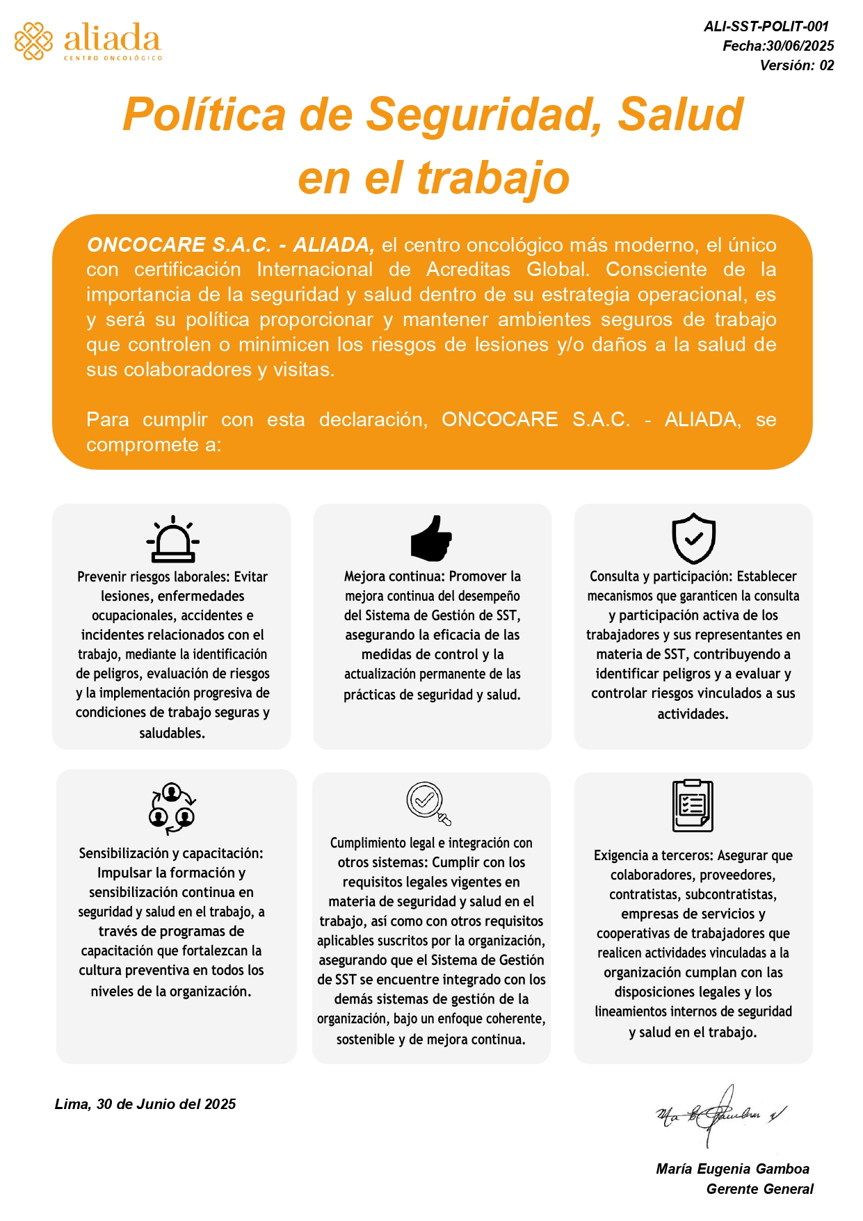 En ALIADA buscamos que el paciente continúe con su vida cotidiana mientras sigue su tratamiento. Por esta razón aplicamos la mayor parte de los tratamientos de quimioterapia de forma ambulatoria, en ambientes adecuados y con el equipamiento y la supervisión necesarios para garantizar calidad en la atención, comodidad y seguridad al paciente. Todos estos servicios son ofrecidos con los estándares certificados por la AAAHC (Accreditation Association for Ambulatory Health Care)